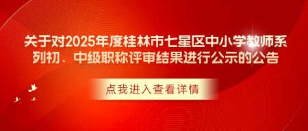 根据2025年度职称评审工作安排和《广西壮族自治区人力资源和社会保障厅关于做好2025年度全区职称评审工作的通知》(桂人社函〔2025〕115号)、《桂林市人力资源和社会保障局关于做好2025年度全市职称评审工作的通知》(市人社发〔2025〕9号)等文件精神,经评审、复核,现对2025年度桂林市技工学校教师系列初级、中级职称评审结果进行公示。公示期间为本公告发布之日起5个工作日。
