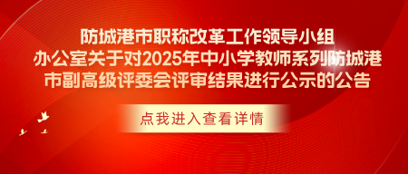 根据我市 2025 年度中小学教师系列职称评审情况,现决定对防城港市 2025 年度中小学教师系列副高级职称评审结果进行公示。公示时间为本公告发布之日起 5 个工